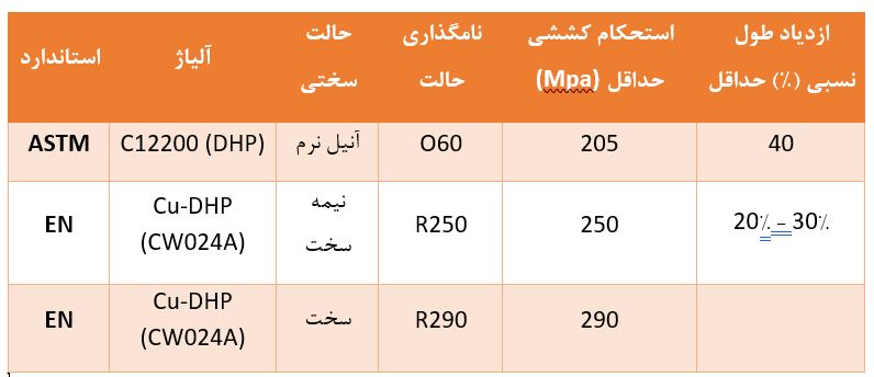 خلاصه مشخصات مکانیکی لولههای مسی بابک بر اساس استانداردهای بینالمللی