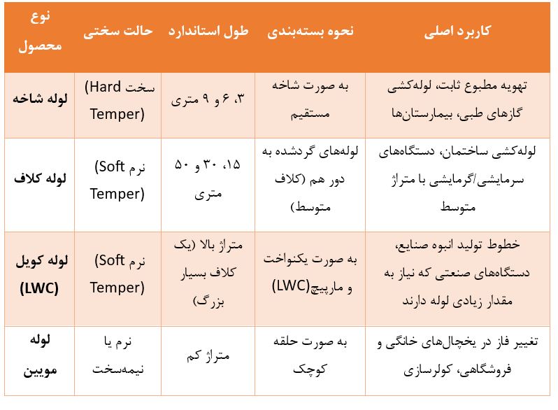لوله مسی بر اساس نوع کاربرد، درجه سختی (Temper) و نحوه بستهبندی، در اشکال مختلفی عرضه میشود که هر کدام برای مصارف خاصی بهینه شدهاند.