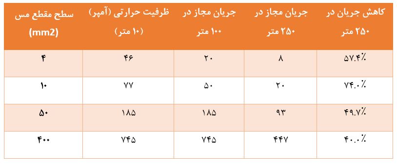 جریان مجاز کابل افشان مسی (سه‌فاز ۳۸۰ ولت) بر اساس مسافت