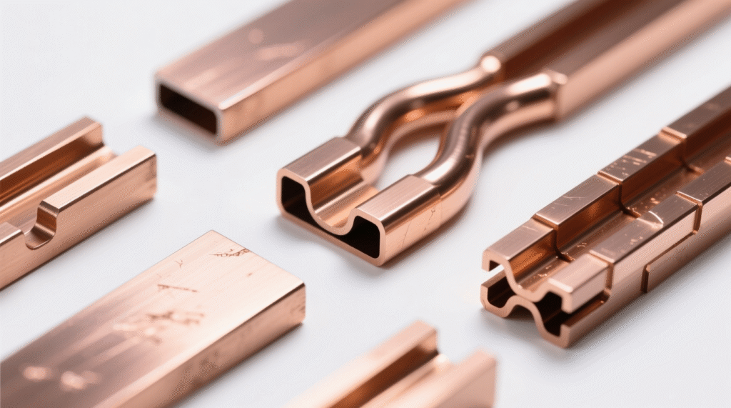 • روش اکستروژن (Extrusion): در این روش، شمش یا بیلت مس با اعمال فشار شدید از طریق یک قالب با شکل مشخص عبور داده می‌شود. این روش برای تولید مقاطع با دقت بسیار بالا، چگالی بهبود یافته و استحکام مکانیکی بیشتر استفاده می‌شود. اکستروژن به ویژه برای تولید اشکال پیچیده و سفارشی‌سازی شده در صنایع حساس مانند الکترونیک و هوافضا کاربرد فراوانی دارد.