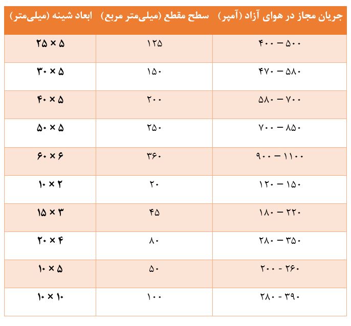 جدول زیر نمونه‌ای از راهنمای انتخاب شینه مسی بر اساس ابعاد و جریان مجاز را نشان می‌دهد:
