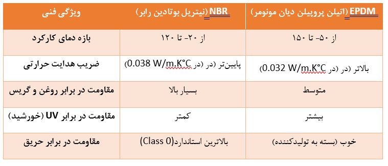 عایقهای الاستومری اغلب بر پایه نیتریل بوتادین رابر (NBR) یا اتیلن پروپیلن دیان مونومر (EPDM) ساخته میشوند. اگرچه این دو نوع عایق از نظر عملکردی شباهت زیادی دارند، اما تفاوتهای فنی کوچکی در آنها وجود دارد که انتخاب نهایی را در پروژههای تخصصی تحت تأثیر قرار میدهد :