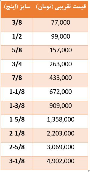 جدول زیر نمونه‌ای از قیمت‌های سه راهی مسی بر اساس سایز را در یک مقطع زمانی مشخص نشان می‌دهد: