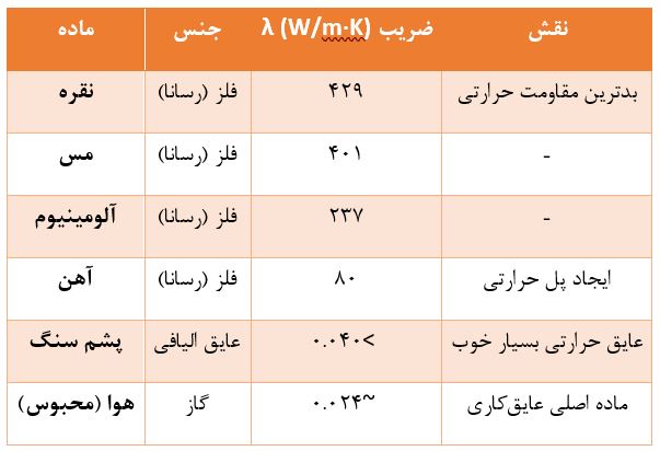 جدول مقایسه ضریب هدایت حرارتی (λ) مواد منتخب