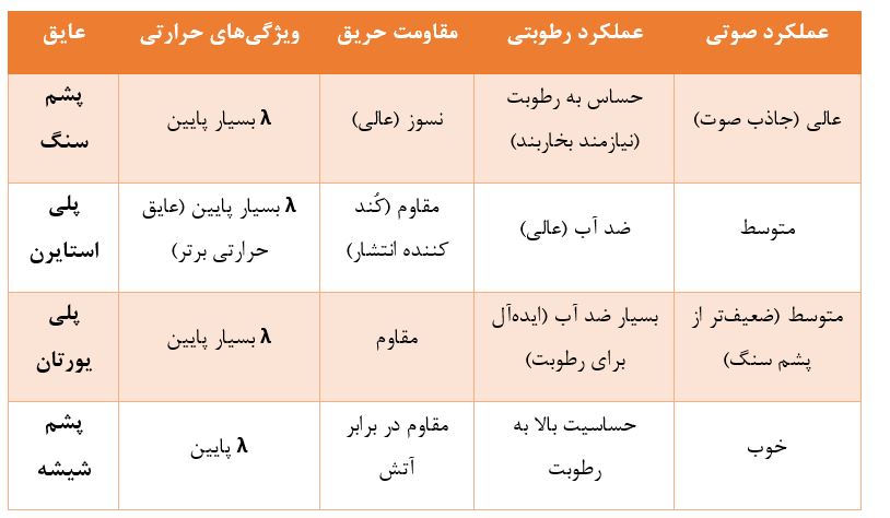 انتخاب ماده عایق مناسب به عوامل متعددی از جمله محیط کاربرد، نیازهای عملکردی (صوتی، حرارتی، رطوبتی) و ملاحظات اقتصادی بستگی دارد. در این بخش به بررسی فنی متداولترین مواد عایق میپردازیم.