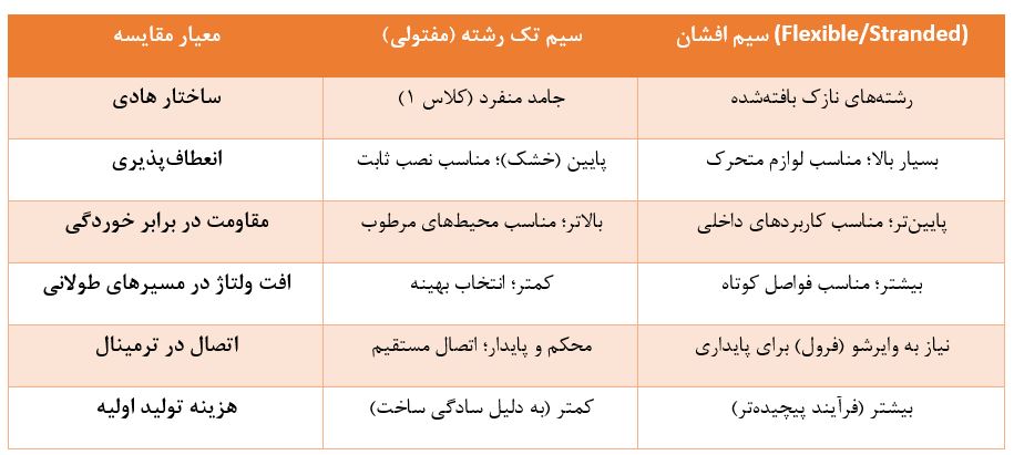 جدول ۱: مقایسه فنی و کاربردی سیم تک رشته (مفتولی) و سیم افشان
