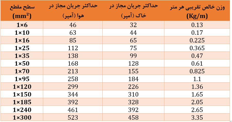 جدول تخصصی حداکثر جریان مجاز سیم مفتولی (NYY تک رشته)